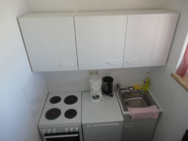 - Küchen mit Herd, Kühlschrank und Mikrowelle