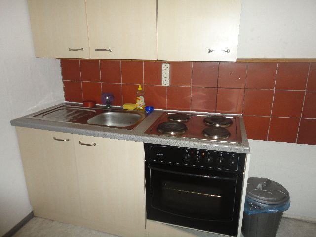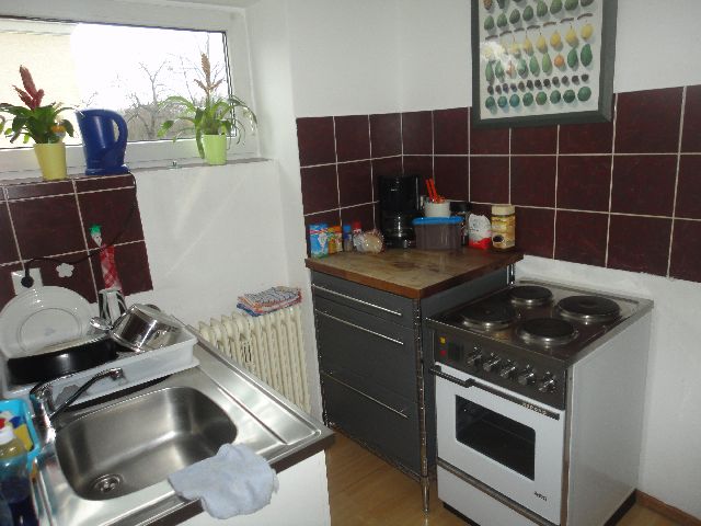 - Küchen mit Herd, Kühlschrank und Mikrowelle